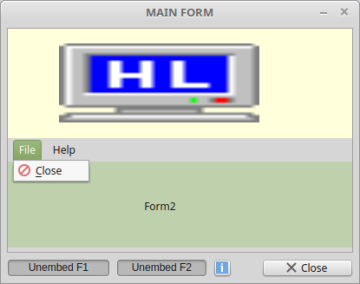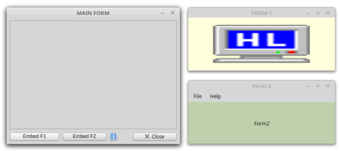 Public Sub Form_Open() Application.MainWindow = FMain FMain.Resizable = False FMain.TopOnly = True FMain.Text = "MAIN FORM" ' Positioning and opening of all 3 windows Form1.Move(FMain.X + FMain.W + 20, FMain.Y) Form1.Show() Form2.Move(FMain.X + FMain.W + 20, FMain.Y + Form1.H + 48) Form2.Show() ' Vertical placement of child elements in the embedding panel panContainer.Arrangement = Arrange.Vertical ' FInsert or remove Form1 and Form2 – set button text btnEMUNForm1_Click() btnEMUNForm2_Click() End Public Sub btnEMUNForm1_Click() If btnEMUNForm1.Value Then Form1.Reparent(panContainer, 0, 0) btnEMUNForm1.Text = ("Unembed F1") Else Form1.Reparent(Null) btnEMUNForm1.Text = ("Embed F1") Endif End ...