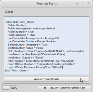 Private hFEmbedded As FEmbedded Public Sub Form_Open() FMain.Center() ' Weitere Initialisierungen ... SwitchButton1.Value = False hFEmbedded = New FEmbedded(&HE1EAF6, panEmbedder) End ' Form_Open()