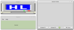 - Zuerst werden drei Top-Level-Fenster erzeugt und nacheinander gruppiert angezeigt. Dann können Sie die beiden Fenster Form1 und Form2 in einen (hier gemeinsamen) Container einfügen. Die beiden eingefügten Fenster können Sie – unabhängig voneinander – wieder als Top-Level-Fenster auf den Desktop setzen. Die Reihenfolge des Einfügens oder Entfernens ist frei wählbar. Als Besonderheit gilt: Wenn das Haupt-Fenster geschlossen wird, dann werden die beiden Fenster Form1 und Form2 automatisch geschlossen. Über die Eigenschaft Application.MainWindow = FMain stellen Sie dieses Verhalten ein.