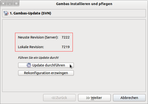 Wenn beim Programm-Start diese Oberfläche angezeigt wird, dann können Sie entweder eine Rekonfiguration der Quellen erzwingen oder das Programm abbrechen oder die angezeigte lokale Version von Gambas nach 'Weiter' installieren – sofern das noch nicht geschehen ist: