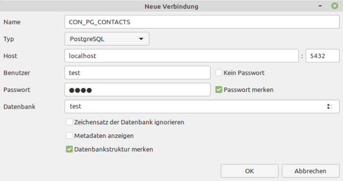 Abbildung 22.4.1.4.1: Neue DB-Verbindung zu einer PostgreSQL-Datenbank 'test' erzeugen
