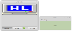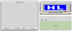 - First, three top-level windows are created and displayed grouped one after the other. Then you can insert the two windows Form1 and Form2 into a (here common) container. You can place the two inserted windows - independently of each other - back on the desktop as top-level windows. The order of insertion or removal is freely selectable. As a special feature: When the main window is closed, the two windows Form1 and Form2 are closed automatically. You set this behaviour via the property Application.MainWindow = FMain.