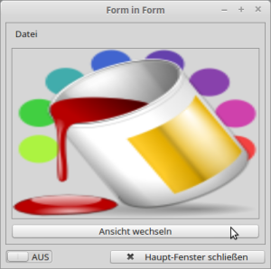 In order to focus attention on inserting a form into a (main) form, the functionality of the (main) form is spartan. It is limited to making the background colour of the inserted form visible via a SwitchButton and a button with which the (main) form can be closed. The inserted form displays either a text in a TextArea or a picture in a PictureBox. Switching is done with the 'Switch View' button on the inserted form. An inserted form has no title bar with the window title and the usual buttons because it is not a top-level window. Therefore, the inserted form has a menu to show here that the inserted form is its own event observer and therefore you can manage its events - such as _Close() - in the source code of the class itself.