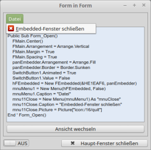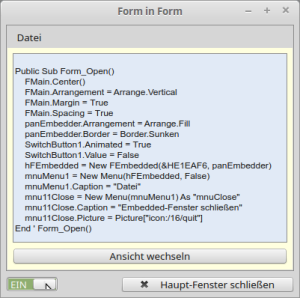 Private hFEmbedded As FEmbedded Public Sub Form_Open() FMain.Center() ' Weitere Initialisierungen ... SwitchButton1.Value = False hFEmbedded = New FEmbedded(&HE1EAF6, panEmbedder) End ' Form_Open()