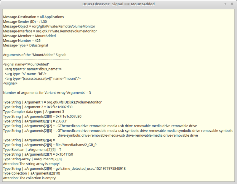 In addition, here is an excerpt of the output of the dbus-monitor programme when a USB stick has been inserted and, among other things, the D-Bus signal “VolumeAdded” of the object /org/gtk/Private/RemoteVolumeMonitor triggered then is displayed with the values of its arguments: